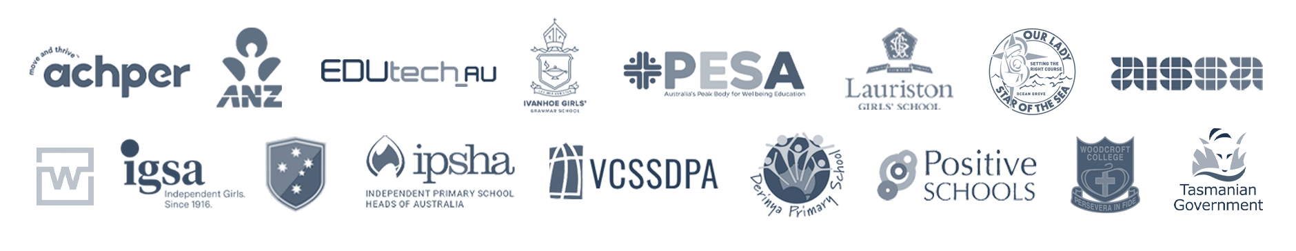 Collection of logos from various educational and governmental organizations, including Achper, ANZ, EDUtech AU, Ivanhoe Girls' School, PESA, Lauriston Girls' School, Star of the Sea, ISSA, IGSA, Ipsha, VCSSDPA, Derina Primary School, Positive Schools, Woodcroft College, and Tasmanian Government.